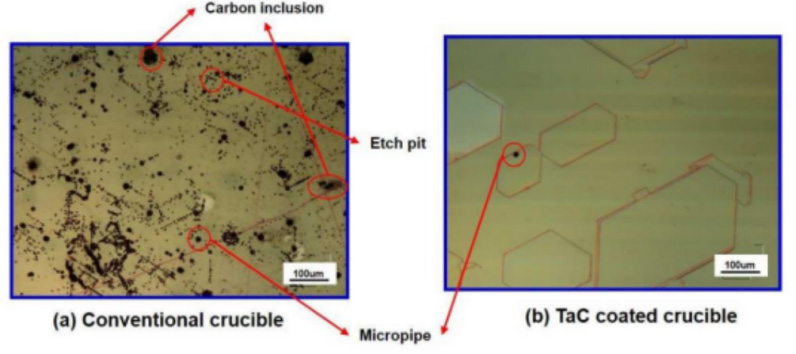 โดยทั่วไปจะมีกลยุทธ์สำคัญสามประการสำหรับการควบคุมข้อบกพร่องในผลึกเดี่ยว SIC นอกเหนือจากการเพิ่มประสิทธิภาพพารามิเตอร์การเจริญเติบโตและการใช้วัสดุแหล่งที่มีคุณภาพสูง (เช่นผงแหล่งกำเนิด SIC) การเปลี่ยนเป็นโครเคิลกราไฟต์เคลือบคาร์ไบด์ Tantalum Carbide ยังสามารถส่งเสริมคุณภาพคริสตัลที่ดีขึ้น