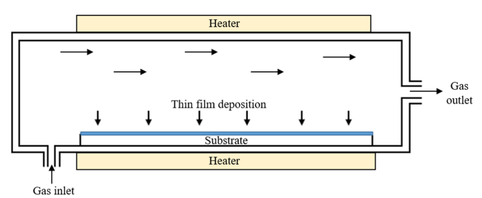 1.สารตั้งต้นของปฏิกิริยาจะถูกส่งไปยังห้องปฏิกิริยาโดยก๊าซตัวพา ก่อนที่จะไปถึงซับสเตรต ก๊าซปฏิกิริยาอาจเกิดปฏิกิริยาเฟสก๊าซที่เป็นเนื้อเดียวกันในการไหลของก๊าซหลัก ทำให้เกิดผลิตภัณฑ์และกลุ่มขั้นกลางบางส่วน