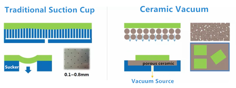 หัวจับโลหะแบบดั้งเดิมมีแรงดูดไม่สม่ำเสมอ มีแนวโน้มที่จะเสียรูปบนวัสดุบางๆ ไม่มีคุณสมบัติป้องกันไฟฟ้าสถิต และมีแนวโน้มที่จะสึกหรอเนื่องจากมีความแข็งต่ำ ในทางกลับกัน หัวจับสูญญากาศแบบเซรามิกเหมาะสำหรับชิ้นส่วนที่บาง มีคุณสมบัติป้องกันไฟฟ้าสถิต และทนทานต่อการสึกหรอและการกัดกร่อน
