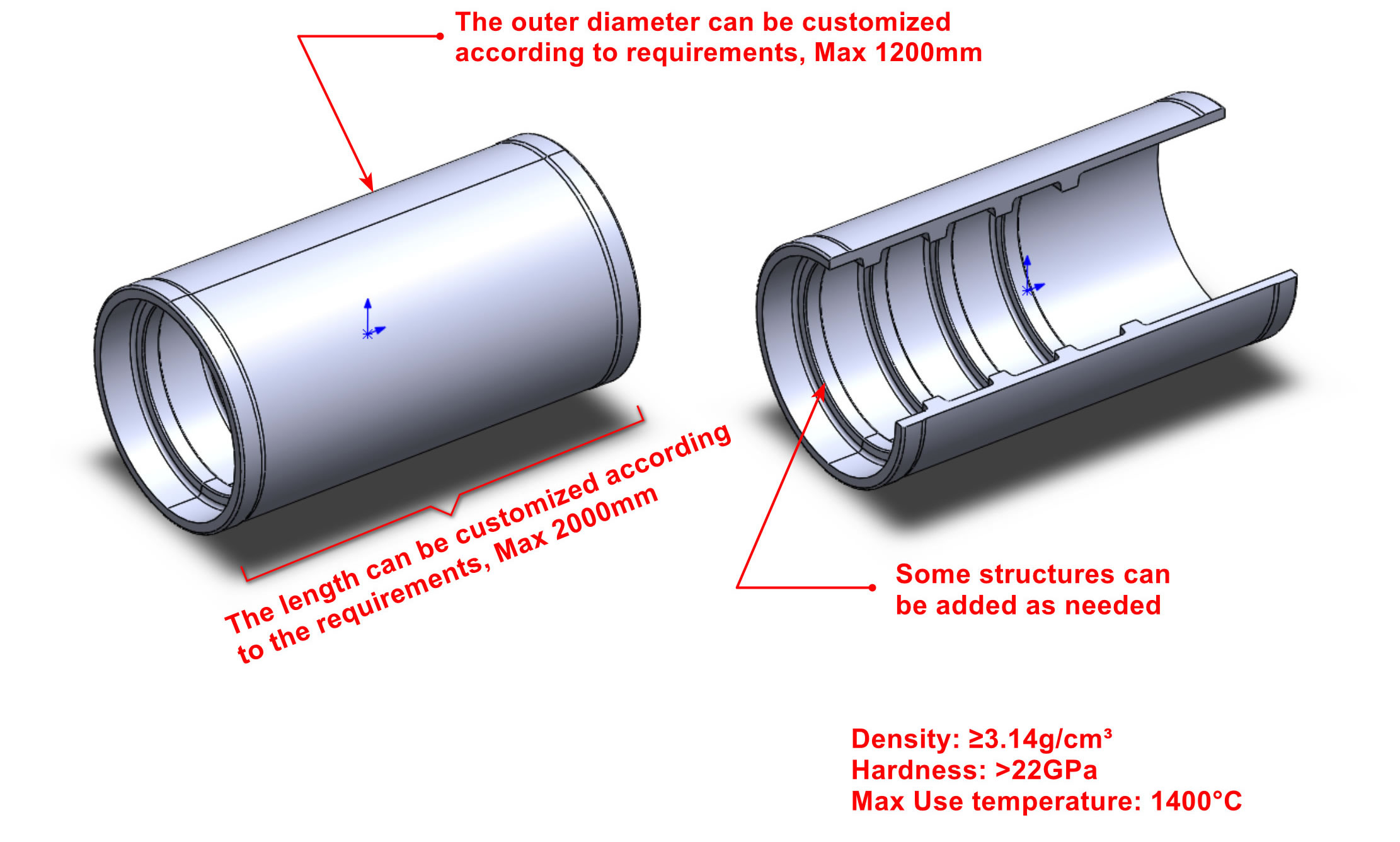 ด้วยเส้นผ่านศูนย์กลางภายนอกสูงสุด 1200 มม. และความสูงสูงสุด 2000 มม. จึงสามารถปรับแต่งไลเนอร์ซิลิคอนคาร์ไบด์ให้ตรงตามข้อกำหนดของอุปกรณ์ที่หลากหลายได้ Ra0.2um คือความหยาบของพื้นผิวสูงสุด และพื้นผิวส่วนปลายสามารถขัดให้ละเอียดสำหรับพื้นผิวซีลได้ด้วยความแม่นยำ 0.01 มม.
