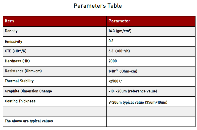 แทนทาลัมคาร์ไบด์เป็นวัสดุประสิทธิภาพสูงโดยมีจุดหลอมเหลวสูงมาก (ประมาณ 3880°C) มีการนำความร้อนที่ดีเยี่ยม มีความเสถียรทางเคมีที่เหนือกว่า และความแข็งแรงเชิงกลที่โดดเด่น พารามิเตอร์ประสิทธิภาพเฉพาะมีดังนี้: